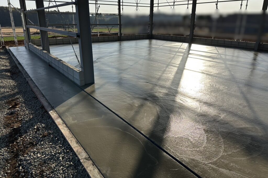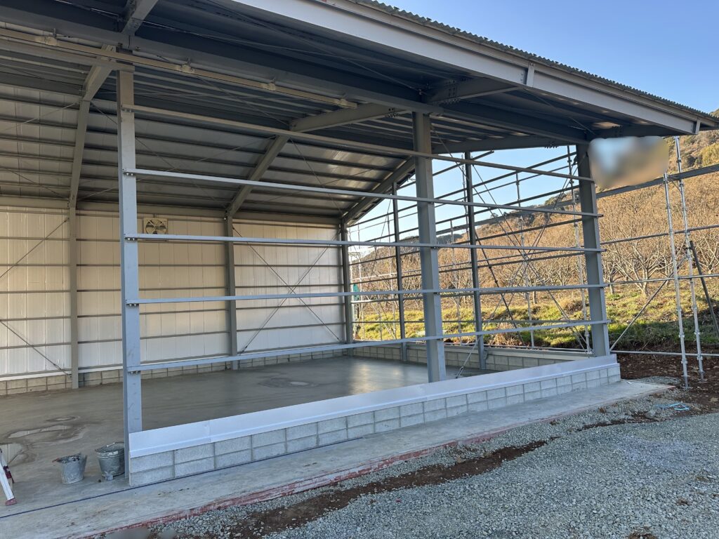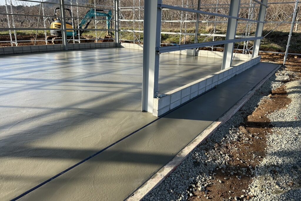 まず土間コンクリートを打設し、重量物の保管や作業にも対応できる